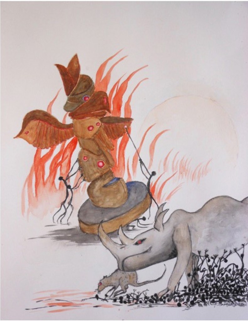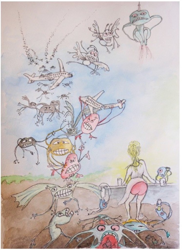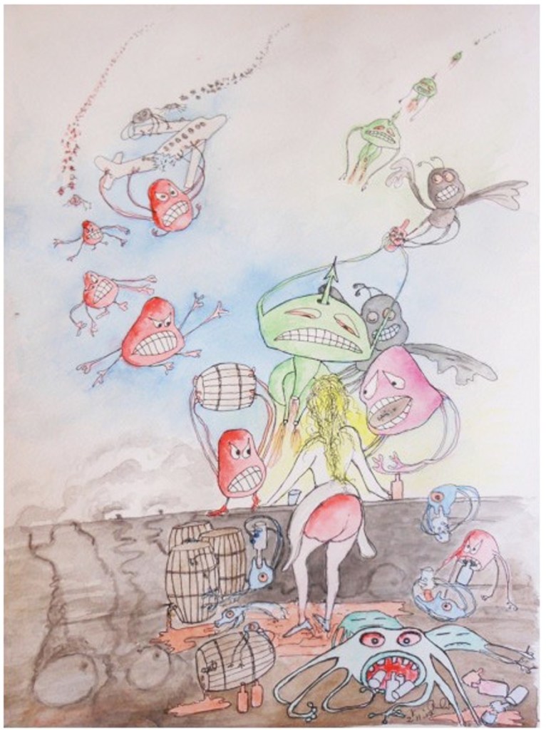 4. The Post- Anthropocene: however, we found a way out, we created articial intelligences, who ledthe wars for us and were generally useful in other ways. Unfortunately this had unforeseen consequences, they took over and bit the hand that created them. There was only one way out, we lured them into traps, in order to make them harmless. A very successful trap: the barmaid and her grog, as illustrated here.
