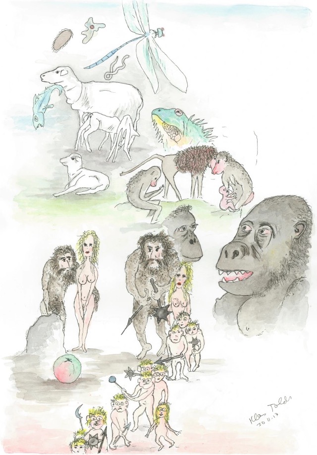 1. The descent of man. A brief outline of human evolution to ‘primitive’ humans. No doubt, we inherited some of the grace of the worm, the ciliate, amoeba and dragonfly, the slippiness of the fish, the beauty of the lizard, the intelligence of the sheep, the sex-obsessiveness of the monkey, the gentleness of the ape, and here we are: at the beginning of history, ready to subdue and transform the world in our image, armed with tools created by us.