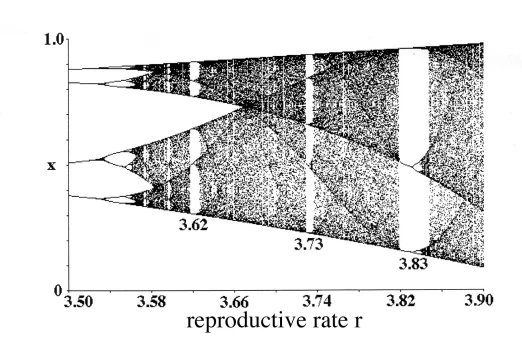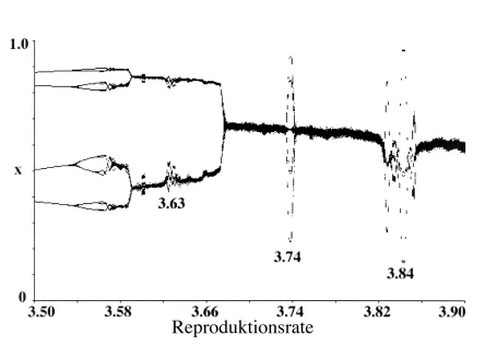May (z.B. 1975 [1]) und andere nach ihm haben gezeigt, dass chaotische Schwankungen in der Populationsgrösse eine Folge intrinsischer (nicht durch Umwelteinflüse bedingter) hoher Raten des Populationswachstums r sind. May benutzte die anscheinend einfache, nonlineare Gleichung xt+1= rxt (1- xt) (wo xt= Populationsgrösse der Generation t, xt+1= Populationsgrösse der Generation t+1, r = intrinsische Rate des Populationswachstums). Solange das Populationswachstum gering ist, befinden sich Populationen im Gleichgewicht mit einem einzelnen Wert der Populationsgrösse. Wenn die Wachstumsrate den Wert von 3 überschreitet, lassen sich zuerst 2 Gleichgewichts-Werte feststellen, und dann (mit zunehmenden Wachstumsraten), 4, 8 und 16. Bei Wachstumsraten grösser als r=3.57 schwanken die Populationsgrössen chaotisch (Abbildungen 1 und 2). Diese Schwankungen sind nur scheinbar zufällig, tatsächlich jedoch strikt deterministisch, und äusserst anfällig für geringfügige Unterschiede in den Anfangsbedingungen, d.h., minimale Unterschiede in der anfänglichen Populationsgrösse haben sehr starke Unterschiede in späteren Schwankungen zur Folge, was Voraussagen über die Zukunft unmöglich macht.