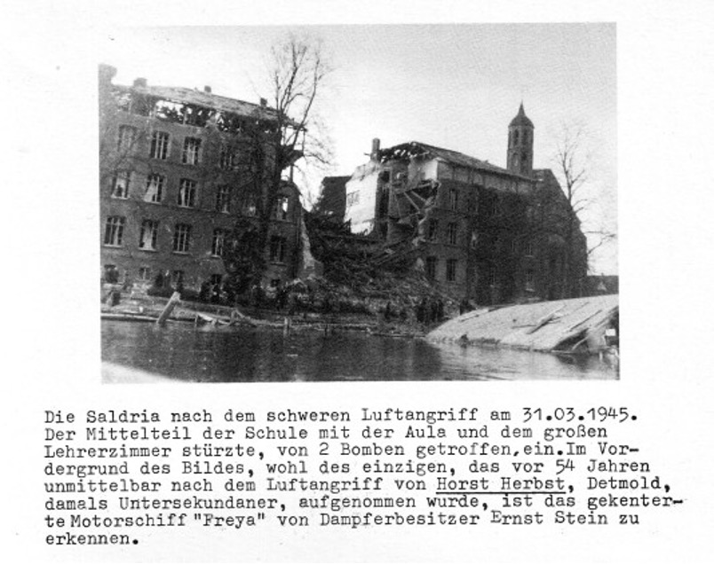 Das einzige, woran ich mich erinnern kann war, dass unser Lateinlehrer einmal im Unterricht sagte, als wir einen der grossen römischen Oratoren (wahrscheinlich Cicero) besprachen, dass auch “unser Führer deshalb so erfolgreich sei, weil er grosse Reden (oder so ähnlich) hielt.” Parteimitglieder unter den Lehrern: das hätte man wegen der Parteiabzeichen merken müssen, aber in meiner Erinnerung ist kein Parteiabzeichen gelagert. Allerdings, gegen Ende 1944 wurde unser Rektor “wegen Verstosses gegen die guten Sitten” (nach der 400Jahr Festschrift der Saldria) in einen abgelegenen Ort strafversetzt. Der Ersatz kam aus Schlesien. Wir waren alle im Hörsaal versammelt, als er in SA-Uniform inmitten einiger SA-Männer erschien und eine kernige Rede hielt. Er überlebte den Krieg nicht, weil die Saldria am Ostersonnabend, 31.3.1945 bei einem Bombenangriff durch zwei Bomben völlig zerstört wurde. Der Rektor und der Oberstudienrat, sowie anscheinend ein Schüler waren die einzigen Anwesenden und kamen um. — Vielleicht sollte ich hier auch erwähnen, dass uns nahegelegt wurde, an Soldaten zu schreiben (ich erinnere mich nicht, ob das obligatorisch und in welcher Schule es war). Ich wollte hoch hinaus und adressierte meinen Brief an den “Admiral eines Schlachtschiffes”. Da es davon anscheinend aber nicht viele gab, wurde der Brief an einen Matrosen eines U-Bootes weiter geleitet, der auch antwortete.