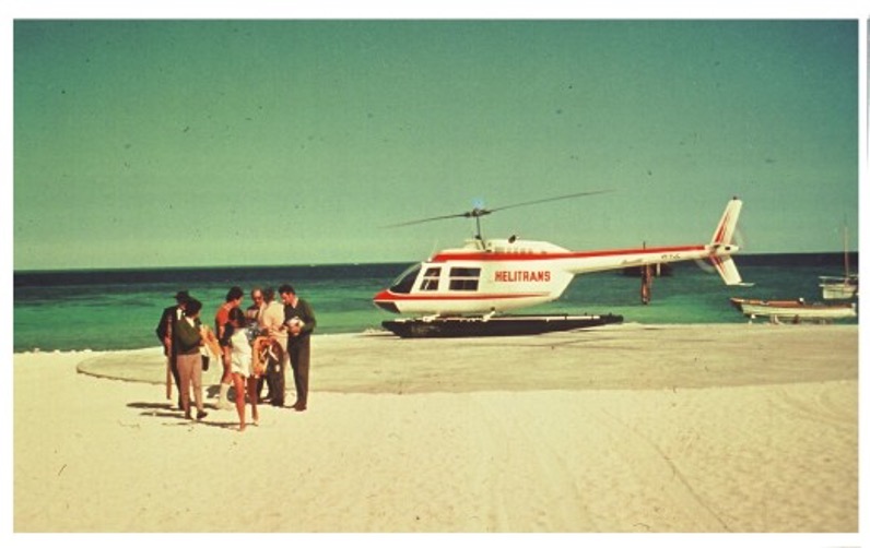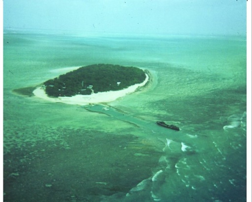 Heron Island, ein etwa 900x300m grosser “cay” am südlichen Ende des Grossen Barriere Riffes, 1974, Vertikalaufnahme. Hafen oben links, Forschungsstation am oberen Ende links, Hotel rechts. Korallenriff um die Insel herum.Source (Quelle) RAAF No.2 squadron. Made available by Professor Peter Flood UNE Armidale, for public domain. Zur gemeinfreien Nutzung von Professor Peter Flood, UNE Armidale, zur Verfügung gestellt.