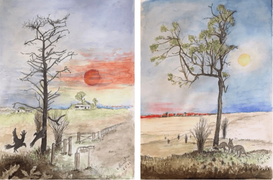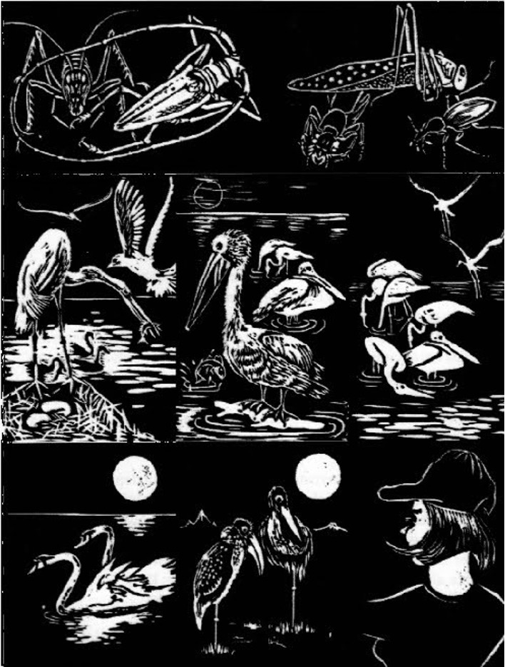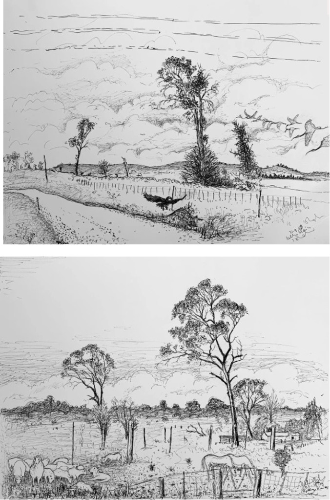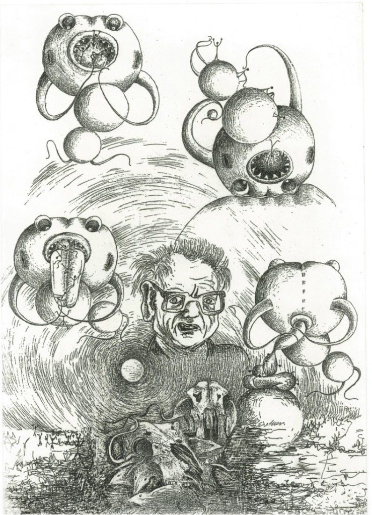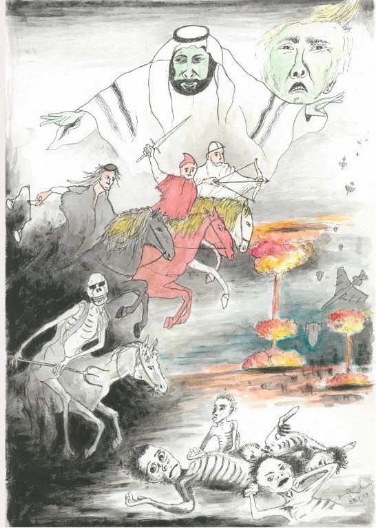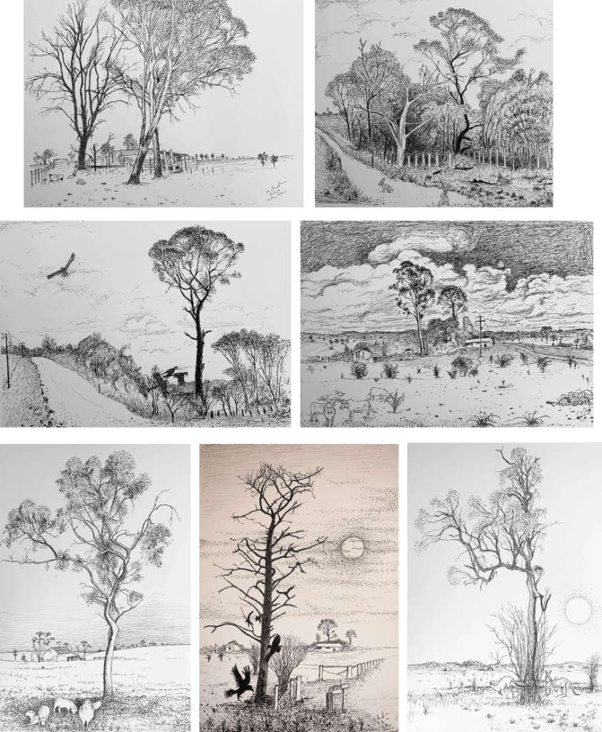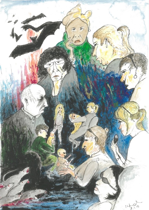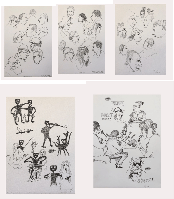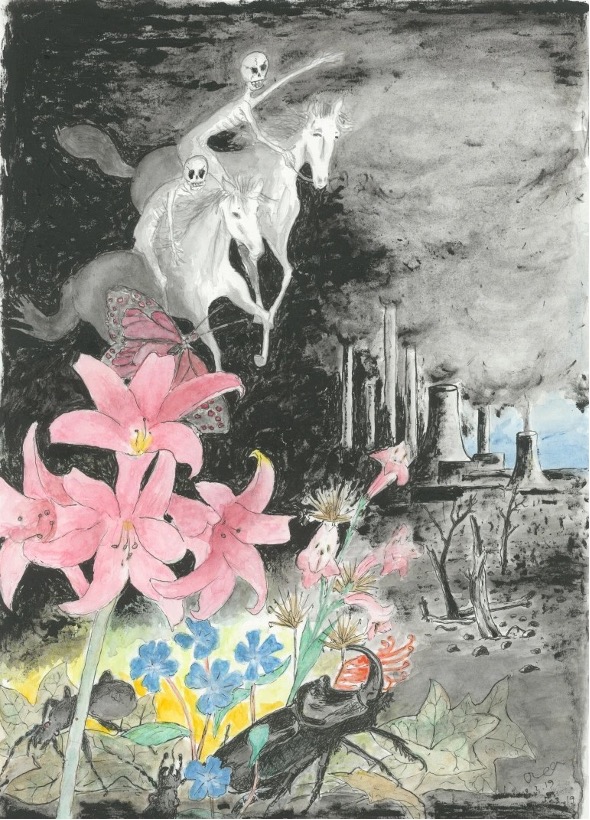 Wasservögel/aquatic birds. Linolschnitt/linocut.Die Schönheit der Natur/the beauty of nature. Linolschnitt/lino cut.Sich entwickelnde Intelligenz im Chaos des Universums, beobachted von einer hohen. Intelligenz/Emerging intelligence in the chaos of the universe observed by a superior intelligence Solarradierung/solar etching.The mad artist/Der verrückte Maler. Tinte/ink.Vogelfamilie/bird family. Solarradierung/solar etching.Bildnis eines berühmten Mannes/image of a famous man. Physiker? Musiker? Popkünstler? Gammler? / physicist? musician? popartist? bum?Holzschnitt/woodcut.Australische Eulen/frogmouths. Holzschnitt/woodcut.Bushfire on the horizon Australia 2019/Waldbrände am Horizont Australien 2019. Ink and water colour/ Oben: Tinte und Aquarell.Left/links: The nine deadly sins today, inspired by Otto Dix, the seven deadly sins /Die neun tödlichen Sünden heute, angelehnt an Otto Dix, die sieben Todsünden. Right/Rechts: Dreams of a great man/Träume eines grosssen Mannes. Ink and water colour/ Tinte und Aquarell.Black gold and black souls/Schwarzes Gold und schwarze Seelen, Australian menagerie/Australische Menagerie (Top to bottom/Von oben nach unten: Murdoch, Hancock, Morrison, George Pell, Dutton, die Puppen: Tony Abbott, Hanson). The Chinese dragon lurks in the back/Der chinesische Drachen lauert im Hintergrund Ink and water colour/ Tinte und Aquarell.To Greta. This is your world. Don’t let them destroy it!/ A Greta. Dies ist Deine Welt. Lass sie sie nicht zerstören! Ink and water colour/ Tinte und Aquarel.Australian Bush (Kellys Plains near Armidale 2019) / Australischer Busch (Kellys Plains nahe Armidale 2019). Ink/Tinte.Australian Bush (Kellys Plains near Armidale 2019) / Australischer Busch (Kellys Plains nahe Armidale 2019). Ink/Tinte.A summernight’s dream/Ein Sommernachtstraum. Ink and water colour/ Tinte und Aquarell.Insect life/Insektenleben. Ink and water colour/Tinte und Aquarell.Apocalyptic horsemen of doom or The last line of defence/ Apokalyptische Reiter des Untergangs oder Die letzte Insel der Verteidigung. Ink and water colour/ Tinte und Aquarell.The four horsemen of the apocalypse, loosely based on Dürer/ Die vier Reiter der Apokalypse, frei nach Dürer. Ink and water colour/ Tinte und Aquarell.Dangers from above and below: bats and rats. And the public could not care less/ Gefahren von oben und unten: Fledermäuse und Ratten. Und das Publikum schläft weiter. Ink and water colour/ Tinte und Aquarell.Jair Bolsonaro joins the club: Jared Kushner and his crony Mohammed bin Salman crownprince of Saudi Arabia, his father in law Donald Trump with bulldog Pompeo. Jair’s plans: ‘develop’ the Amazon, withdraw from the Paris climate accord, dismiss Cuban doctors, use sharpshooters to combat crime, get military into the cabinet, make it easier to get weapons etc/