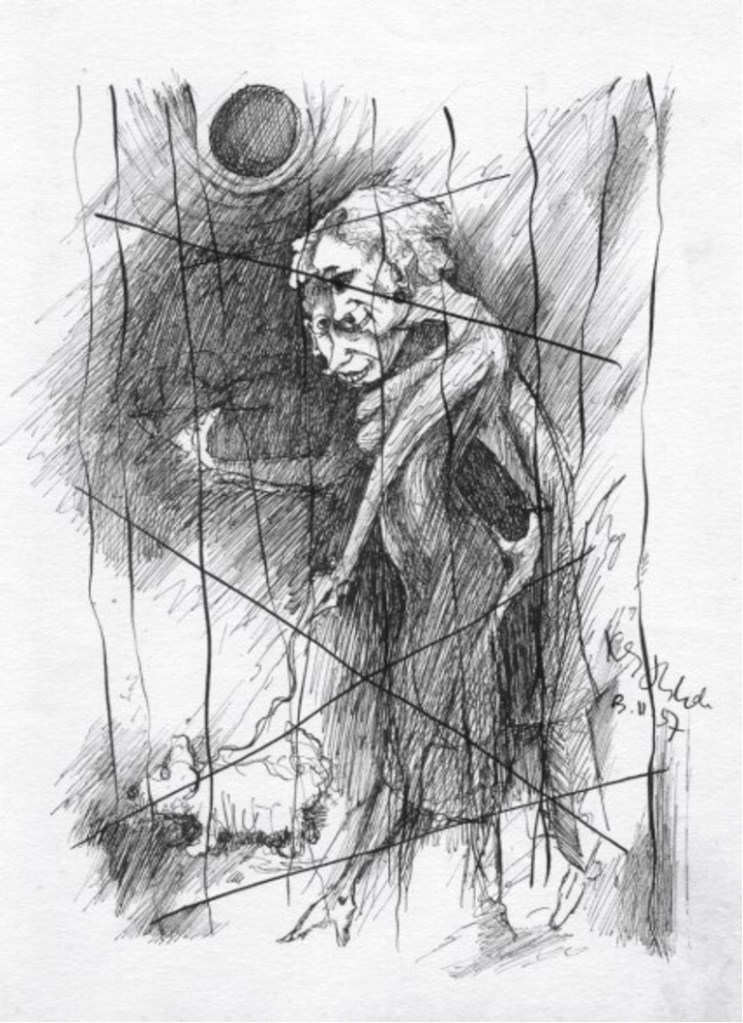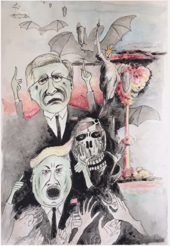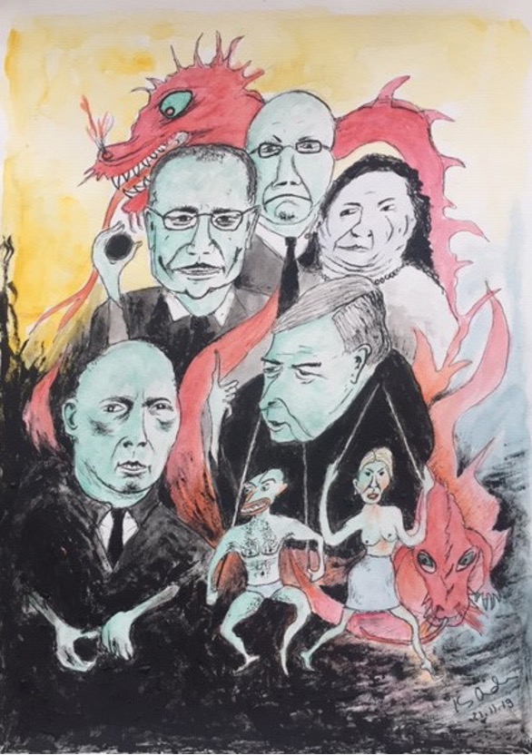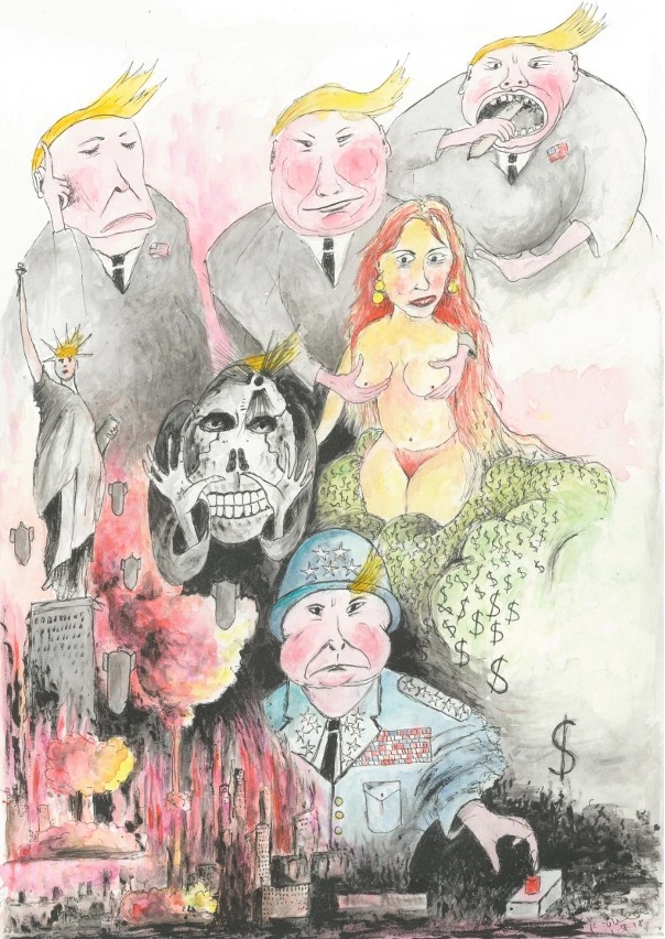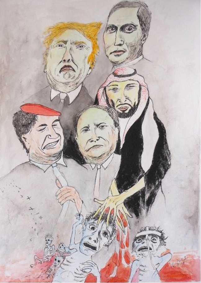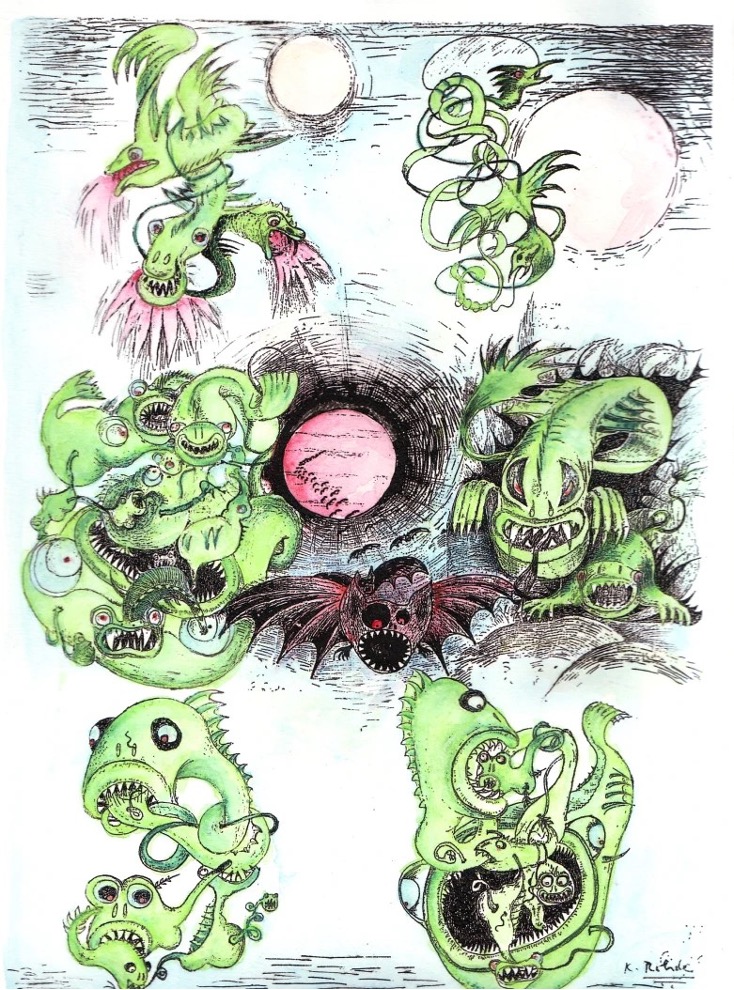 Jair Bolsonaro tritt dem Club bei: Jared Kushner und sein Duzbruder Mohammed bin Salman, Kronprinz von Saudiarabien, sein Schwiegervater Donald Trump mit Bulldogge Pompeo. Jairs Pläne: ‘Entwicklung’ des Amazonasgebietes, Rückzug aus dem Pariser Klimaabkommen, Feuern kubanischer Ärzte, Einsatz von Scharfschützen zur Verbrechensbekämpfung, Militär ins Kabinett, Erleichterung des Waffenbesitzes, usw. Tinte und Aquarell/ink and water colour.Tödliche Zwillinge und ihre Maske/Deadly twins and their mask. Tinte und Aquarell/ink and water colour.Die sieben Todsünden 2018/ the seven deadly sins 2018. Tinte und Aquarell/ink and water colour.Blumensträusse/ Flowers. Tinte und Aquarell/ Ink and water colour.Urwald/Jungle. Solarradierung/Solar etching.Aus meinem Skizzenbuch 2018/From my sketchbook 2018. Tinte/Ink.Tamworth Country music Festival/Tamworth Musikfest. Solar etching/Solarradierung.Ekstatisch/ecstatic. Solarradierung/solar etching.Sündenhaft/sinful. Solarradierung/solar etching.Prisma/prism.Solarradierung/solar etching.Der Schöpfer am Werk/the creator in action. Scherenschnitt/papercut. Als Illustration in einem Gedicht/as illustration in a poem: https://krohde.wordpress.com/2016/03/10/die-schopfung-und-ihr-ende/Eitelkeit/vanity. Linolschnitt/linocut.Der verrückte Maler/The mad artist. Linolschnitt/linocut.Marktökonomie/market economy. Solarradierung/Solar etching.Nazi Tintenzeichnung/Ink drawing.Selbstbildnis als Vielfrass/self-portrait as glutton. Solarradierung/solar etching.Autoritär/autoritarian. Tintenzeichnung/ink drawing.Sag doch mal was/say something. Solarradierung/solar etching.Invasion der Aliens/invasion of the aliens. Handkolorierte Solarradierung/hand coloured solar etching.Der Dom zu Münster um 1954/The cathedral in Münster around 1954. Bleistift/pencil.Erfurter Dom und Severikirche/The cathedral and Severi church in Erfurt. Tinte/ink.Der Kater/hangover. Tinte/ink.