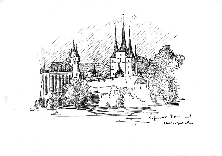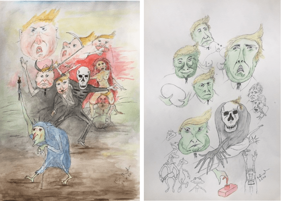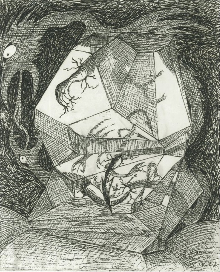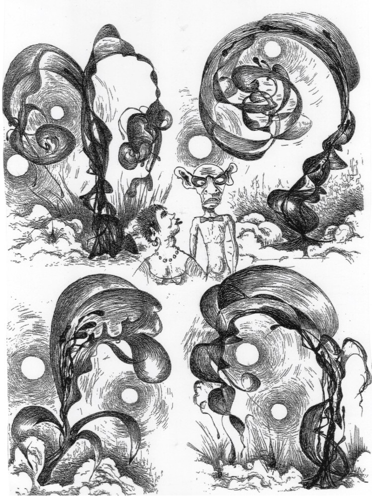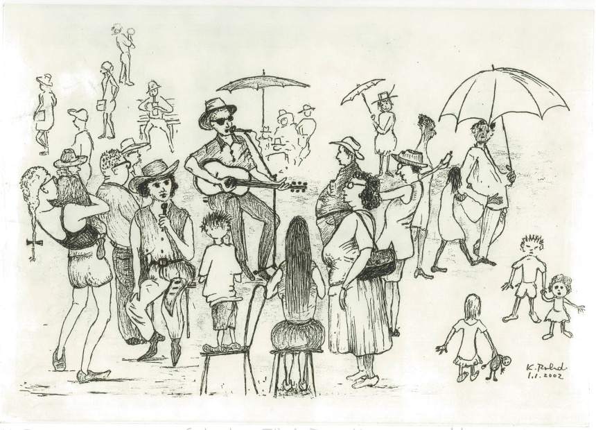 Jair Bolsonaro tritt dem Club bei: Jared Kushner und sein Duzbruder Mohammed bin Salman, Kronprinz von Saudiarabien, sein Schwiegervater Donald Trump mit Bulldogge Pompeo. Jairs Pläne: ‘Entwicklung’ des Amazonasgebietes, Rückzug aus dem Pariser Klimaabkommen, Feuern kubanischer Ärzte, Einsatz von Scharfschützen zur Verbrechensbekämpfung, Militär ins Kabinett, Erleichterung des Waffenbesitzes, usw. Tinte und Aquarell/ink and water colour.Tödliche Zwillinge und ihre Maske/Deadly twins and their mask. Tinte und Aquarell/ink and water colour.Die sieben Todsünden 2018/ the seven deadly sins 2018. Tinte und Aquarell/ink and water colour.Blumensträusse/ Flowers. Tinte und Aquarell/ Ink and water colour.Urwald/Jungle. Solarradierung/Solar etching.Aus meinem Skizzenbuch 2018/From my sketchbook 2018. Tinte/Ink.Tamworth Country music Festival/Tamworth Musikfest. Solar etching/Solarradierung.Ekstatisch/ecstatic. Solarradierung/solar etching.Sündenhaft/sinful. Solarradierung/solar etching.Prisma/prism.Solarradierung/solar etching.Der Schöpfer am Werk/the creator in action. Scherenschnitt/papercut. Als Illustration in einem Gedicht/as illustration in a poem: https://krohde.wordpress.com/2016/03/10/die-schopfung-und-ihr-ende/Eitelkeit/vanity. Linolschnitt/linocut.Der verrückte Maler/The mad artist. Linolschnitt/linocut.Marktökonomie/market economy. Solarradierung/Solar etching.Nazi Tintenzeichnung/Ink drawing.Selbstbildnis als Vielfrass/self-portrait as glutton. Solarradierung/solar etching.Autoritär/autoritarian. Tintenzeichnung/ink drawing.Sag doch mal was/say something. Solarradierung/solar etching.Invasion der Aliens/invasion of the aliens. Handkolorierte Solarradierung/hand coloured solar etching.Der Dom zu Münster um 1954/The cathedral in Münster around 1954. Bleistift/pencil.Erfurter Dom und Severikirche/The cathedral and Severi church in Erfurt. Tinte/ink.Der Kater/hangover. Tinte/ink.