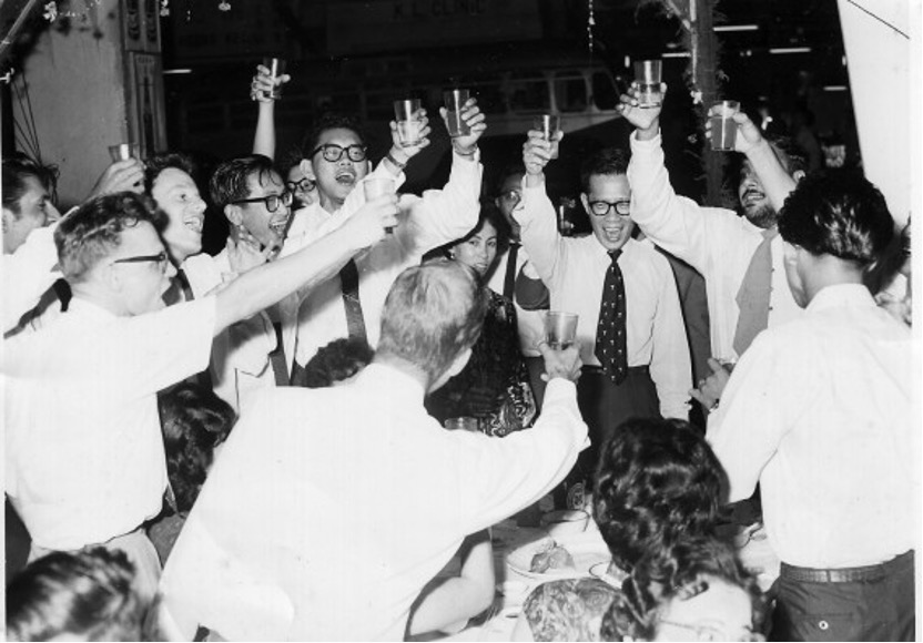 Alle Dozenten des zoologischen Institutes ausser mir waren ursprünglich in Singapore. Gemäss der Wikipedia hat die University of Malaya einen weltweiten Rang unter den ersten 200, und die University of Singapore liegt zur Zeit auf Rang 30. In Kuala Lumpur waren die biologischen Wissenschaften wie Zoologie und Botanik wegen der einzigartigen Flora und Fauna immer besonders stark. Vice-Chancellor (Rektor) der Universität war zu meiner Zeit (bis 1965) ein berühmter Mathematiker, Professor Sir Alexander Oppenheim, besonders bekannt durch die Oppenheim Conjecture. Auch er war ursprünglich in Singapore. Kanzler war Tunku Abdul Rahman, der Premierminister der malayischen Föderation. Nach dem Rücktritt Sir Alexander Oppenheims wurde Professor Rayson Huang, ein Chemiker, Aktierender Rektor; er wurde später Rektor der University of Hongkong. Einige international führende Wissenschaftler waren an der Universität, wie zum Beispiel Professor Christie Jayaratnam Eliezer, wohl bekannt durch seine Beiträge zur theoretischen Physik und Mathematik; er war ein Tamil aus Sri Lanka, promovierte bei Paul Dirac, und ging später an die LaTrobe University in Melbourne in Australien. Das Zoologische Institut war geräumig, mit klimatisierten Räumen. Es gelang mir, von der Deutschen Forschungsgemeinschaft ein gutes Forschungsmikroskop, einen Mikromanipulator, sowie eine Anzahl wissenschaftlicher Bücher zu erlangen. Besonders günstig war, dass das Institut gut mit technischen Assistenten und Assitentinnen versorgt war. So hatte ich zwei persönliche Assistenten. Ausserdem hatten wir gut qualifizierte Leute, die uns auf Expeditionen begleiteten und auch in den Laboratorien halfen. – Der menschliche Kontakt mit Kollegen, Studenten und technischen Assistenten/innen war ausgezeichnet. Das folgende Photo zum Beispiel wurde aufgenommen während der Hochzeitsfeier eines unserer Oberassistenten, Teo, mit der Tochter eines anderen Oberassistenten, eines Dayaks aus Nordborneo, der sich gelegentlich im angeheiterten Zustand damit brüstete, in seiner Jugend Kopfjäger gewesen zu sein. Einige Dayaks sind dafür ja wohlbekannt.
